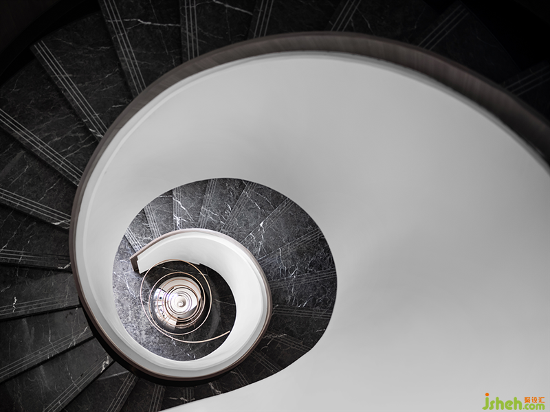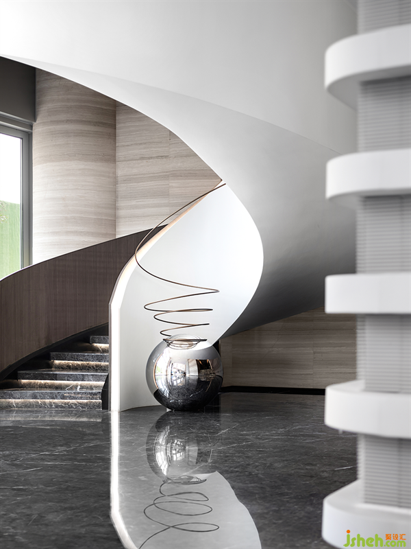 作为楼梯形式中最生动和雕塑感的存在,旋梯引领人全角度看遍风景。武汉售楼处设计空间中嵌入白丝带般的旋梯,如天鹅之颈优雅至极。球形雕塑恰到好处,标定旋梯的轴心,一条金色的螺线盘旋向上,引领人们的视线望上二层。