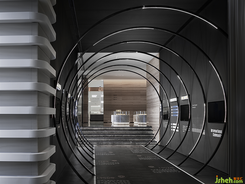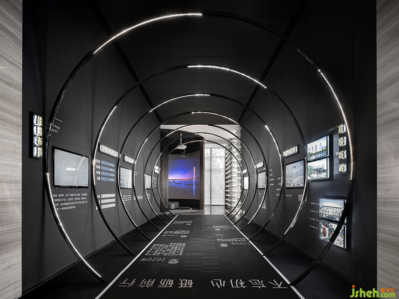 一条时间隧道,连接了两个空间,科技感十足的LED灯带,将方体空间重塑,一环一环加载了穿梭体验。深色背景退后,将注意力投入在屏幕上轮播的影片上,解析产品的精髓。