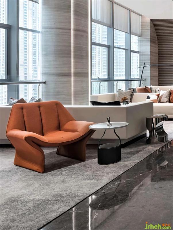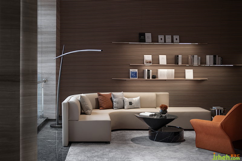 武汉售楼处设计从山形墙面的阶梯式书吧,延续到洽谈区,嵌入隐形结构的层板,在墙面上形成自然书架。暖意的皮革沙发,形成舒适且人文气息浓厚的洽谈场景。橙色的软装点缀在空间中,形成一个个跳跃靓丽的音符。
