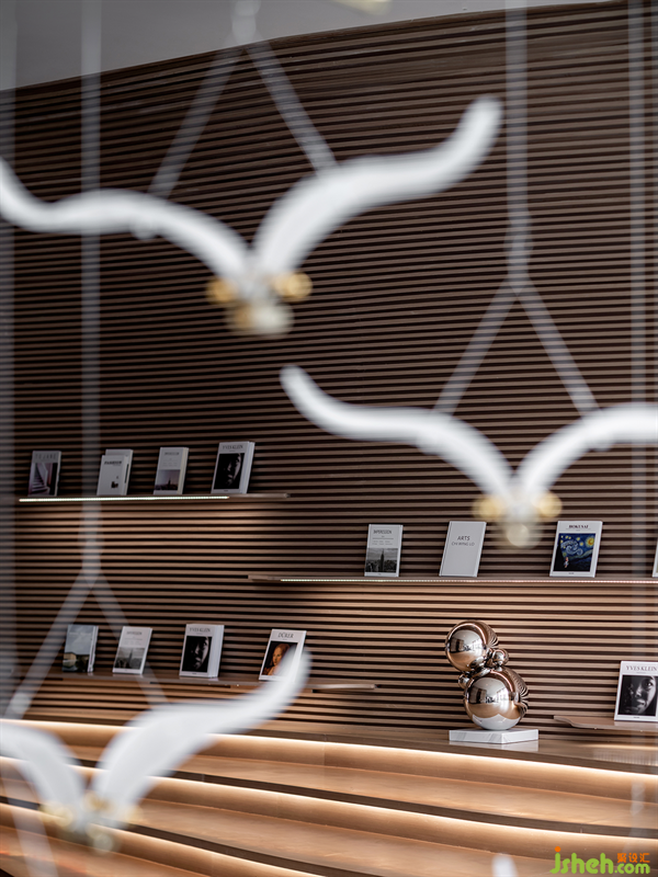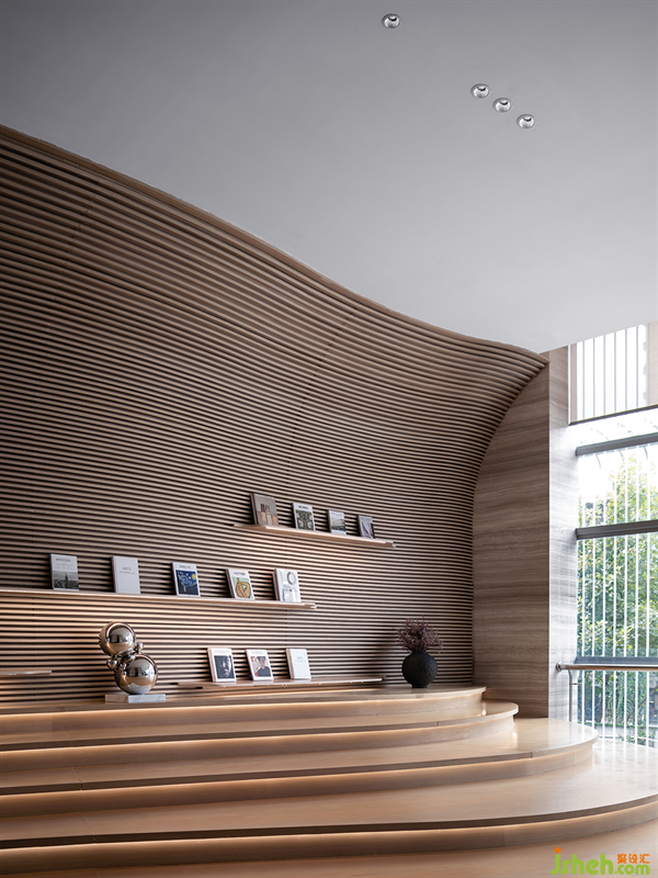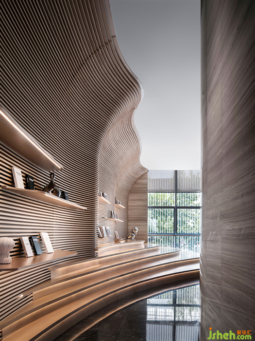 古雅悠长的节奏,具有一种身处山间,自然气息扑面而来的气质。这种悠然的意象,在三层艺术廊中唤起一种内心的向往。山水田园一体,首层透明的水波层叠意象,到了艺术廊就演变成层峦叠嶂的山间密语。