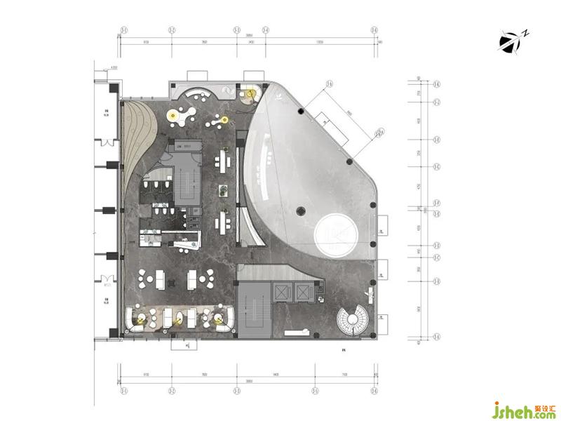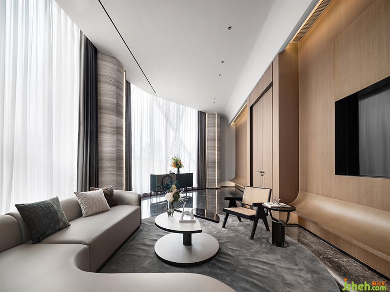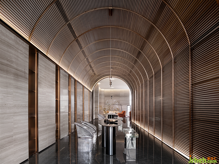 VIP是空间中的归结点,也拥有最好的风景。半圆弧的空间以一种拥抱的姿态构成空间主体,将核心聚拢在洽谈区。木制墙板以完美几何曲线,温文尔雅地表达出对东方人的生活的态度,一如反复吟咏的楚辞,唱诵千年。