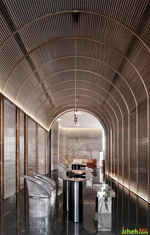 一间优雅的茶室既是两个洽谈区之间的“文化走廊”,亦是多功能室,可满足不同需求。拱面金属格栅造型,弱化空间方与闭塞之感,以柔美的形态点亮空间。吉冈德仁的透明长凳纯净如冰,与钢丝椅并置,透出一种空灵的美感。