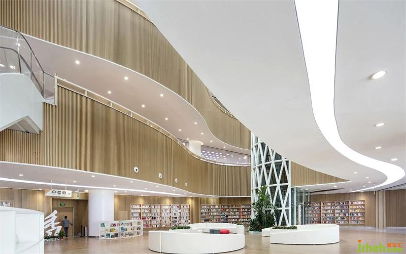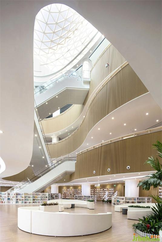 襄阳市图书馆新馆,位于东津新区,是一所集藏书、阅览、信息处理、学术交流、新媒体示范、推广应用为一体的综合性现代化场馆。图书馆设计以繁华喧闹城市中的自然静谧空间体验为设计主旨,在借助光与线条塑造空间优美造型的同时,注重地域纯朴人文、自然、人性化的细节融入。