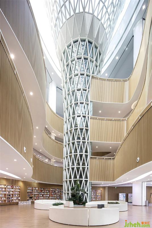 人们在此亲近书籍,空间是静止的,唯有时光缓缓流淌。图书馆设计从天井引入自然光线,在靠近中庭周围营造自然亲切、舒适的阅读氛围。