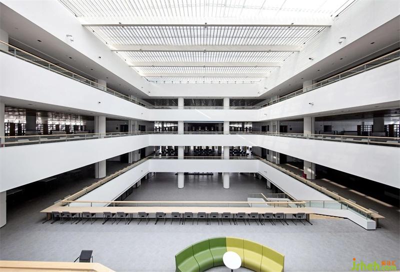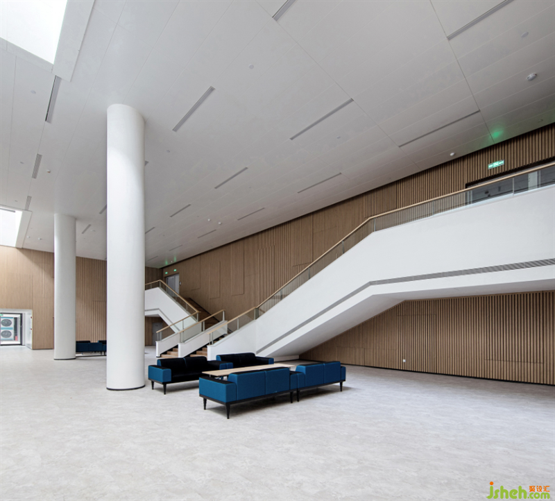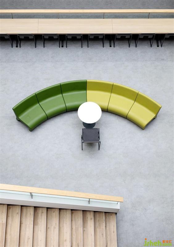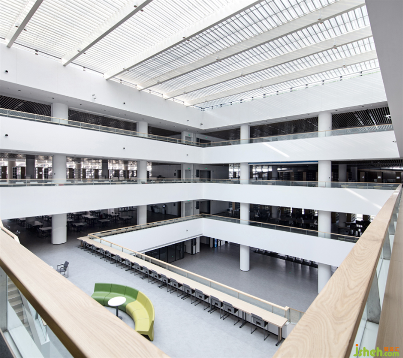 如瀑布般倾泻的光线洒满中庭,整体的白色调中加入柔化空间氛围的木色,点缀的亮色让整体稳重且不失青春活力,空间氛围静谧和谐。师生们可以在靠近中庭周围体验自然亲切、舒适的阅览氛围。