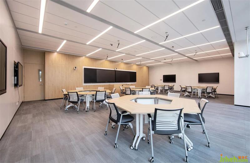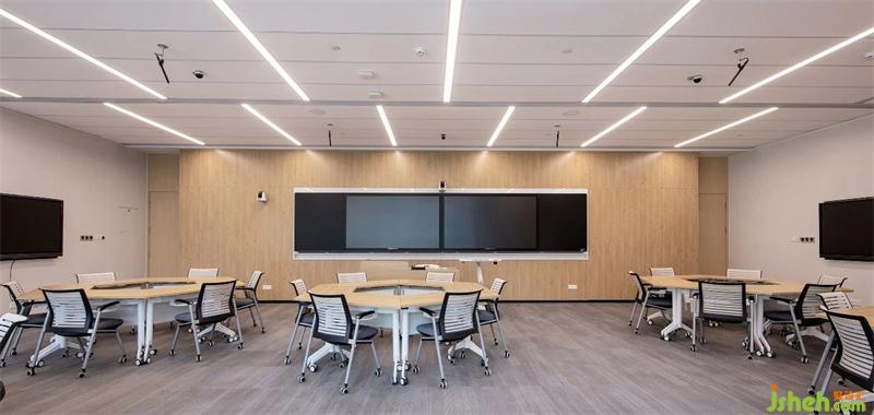 走进智慧教室,数字化屏幕映入眼帘,组合搭配的课桌椅,使交流学习更加便捷高效。富有温暖触感的木饰面和地毯,提升了空间自然简约与科技感的和谐氛围。