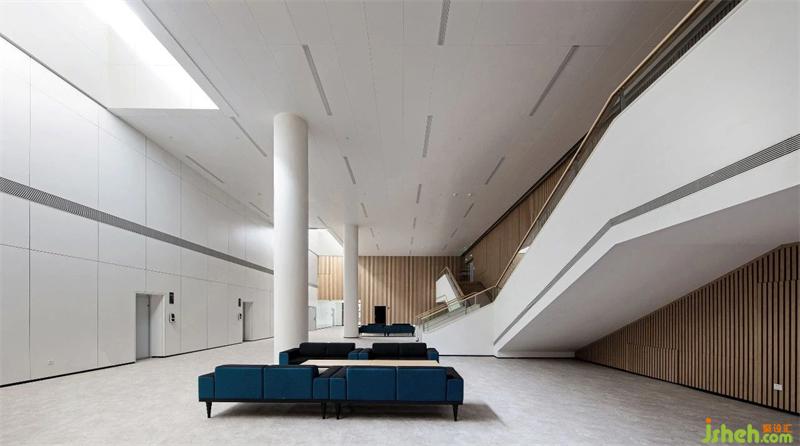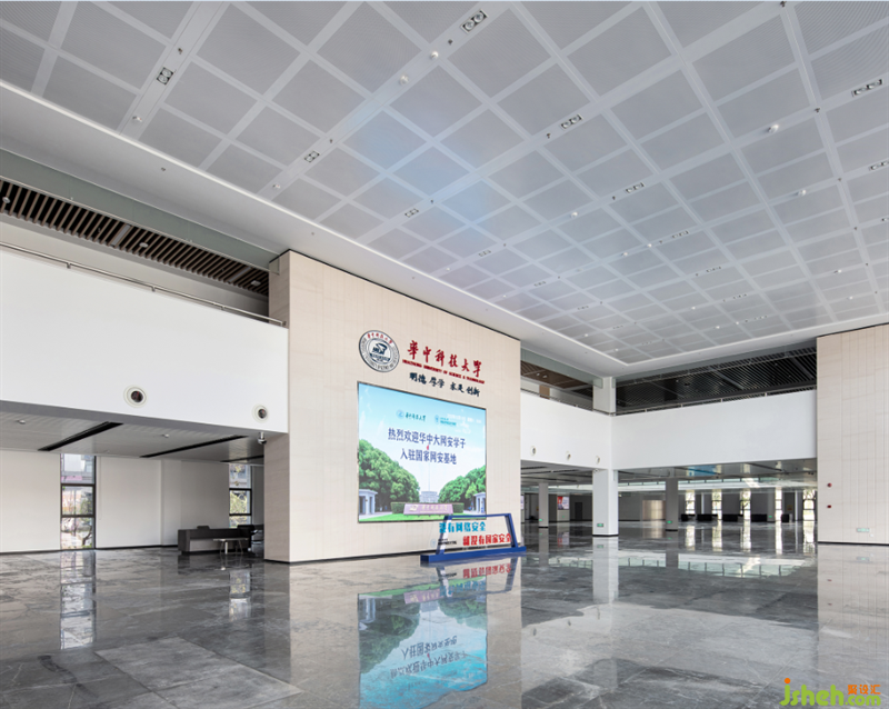大厅空间运用体块组合的原则,以主背景墙为中心体块,两侧空间体块呼应、延伸,形成简洁、整体的视觉感受;顶面采用经过详尽计算的微孔铝板造型,在功能和形式上都遵循统一的空间设计语言。