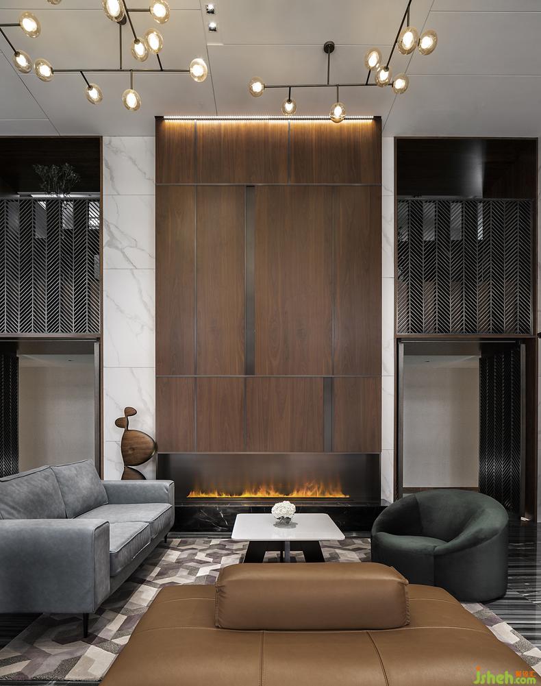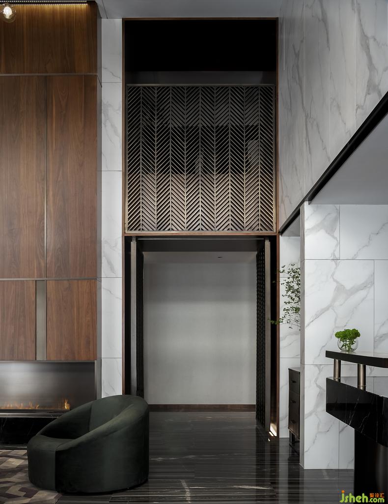 主要材料|蓝金沙石材、古铜不锈钢、胡桃木饰面、岩板