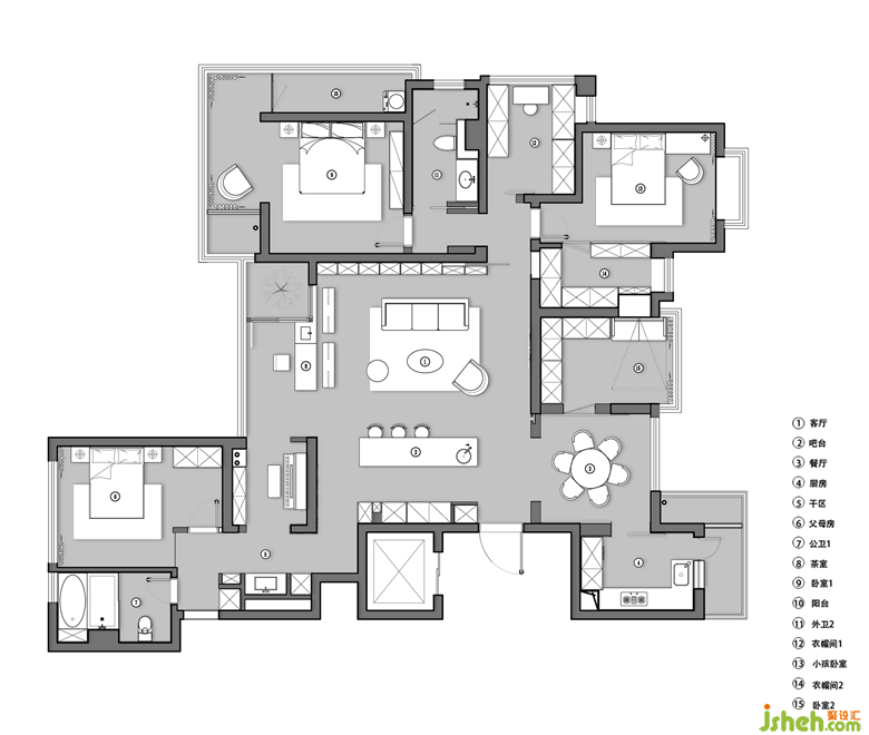在空间布局上,我们规划了一个开放空间,放置西厨、客厅、茶桌、钢琴等功能区,这个空间承载了男女主人和女儿各自的爱好,循序展开,又互相联系,我们定义这个空间为精神空间。以精神空间为中岛,依次展开卧室、餐厨和卫生间等空间。室内设计师
