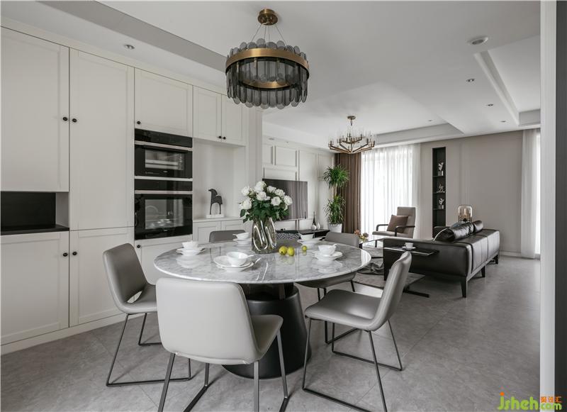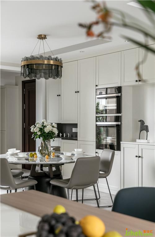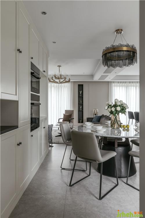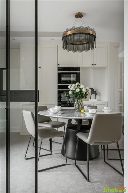 装修设计上我们保留了原建筑房型横厅的效果,在原有餐厅位置我们把岛台和餐桌换了个,这也是出于业主一家生活方式的考虑。雪花白大理石的圆桌简洁的结构和入门西厨柜相得益彰,在储物功能的基础上植入黑色凝练空间的元素,显得更加沉稳,顶部空间铜色和灰玻的映衬下让空间更加饱满富有质感。