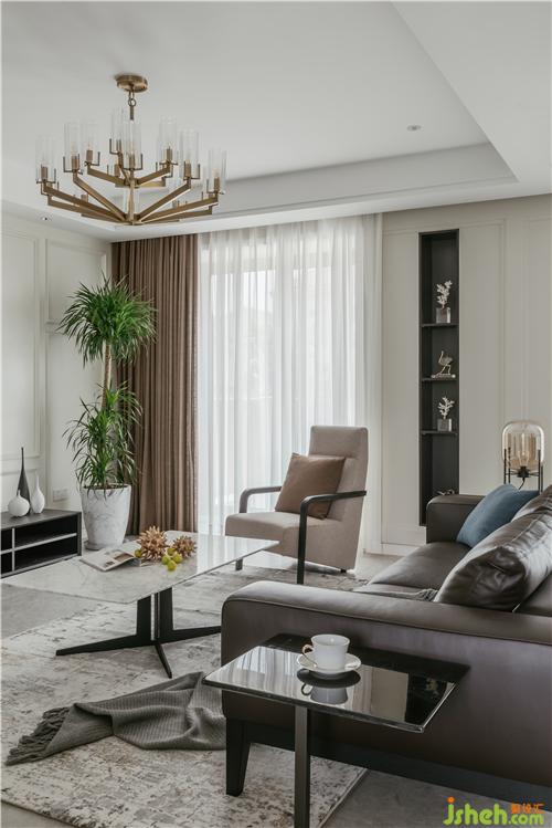 在屋内的色彩选择上依托了家具的皮质颜色,装修设计运用了中性色,背景的线条和悬浮的金属挂件在灯光的映衬下为空间注入了一丝味。