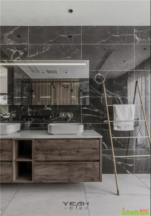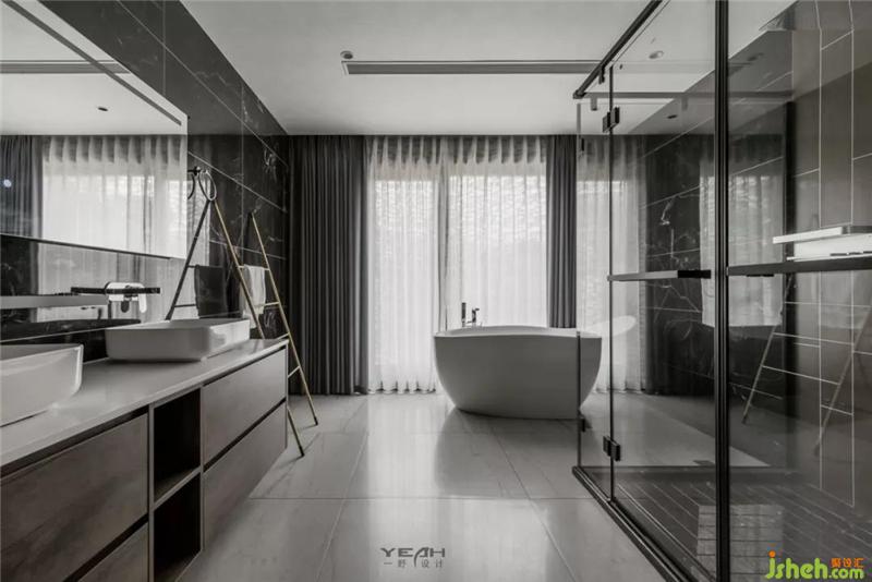 卫生间大面积采用深灰色,装修设计通过点光源局部照明点缀,营造高级、神秘、轻奢的氛围。
