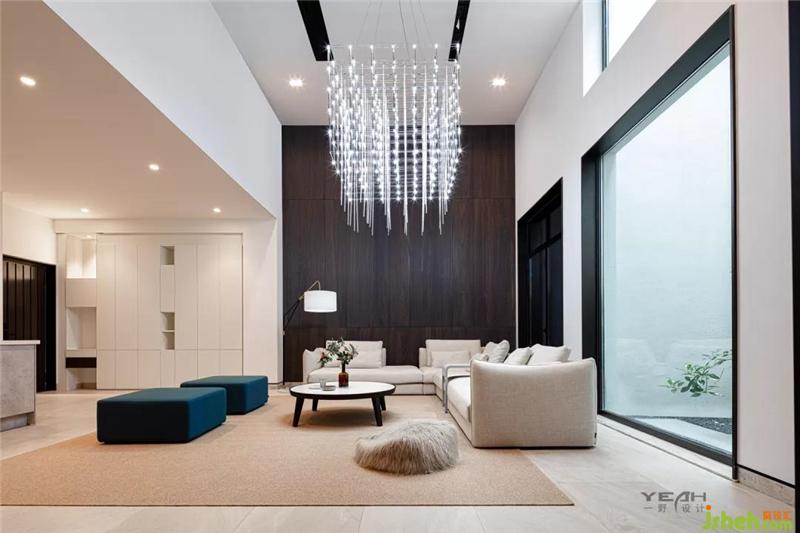 室内采用深灰色和奶油色沙发,搭配几何茶几,别墅装饰以及其他简约摆设来装饰房屋,诸如棉和亚麻织物被广泛采用。