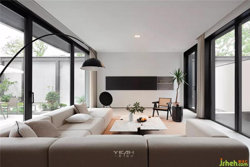 The interior uses dark gray and cream sofas, geometric coffee tables, and other simple furnishings to decorate the house, such as cotton and linen fabrics are widely used.