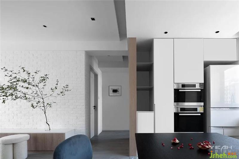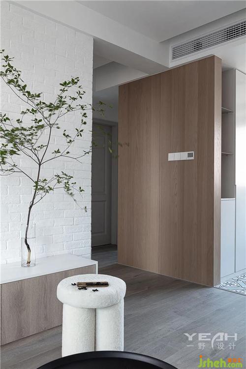 In the treatment of space beam, the continuity of beam body in north-south direction is retained. The beam in the east-west direction of the door head of the study is connected with the wall through the wood veneer. The one-way "line" is transformed into the "body" in the space, which weakens the existence of the beam.