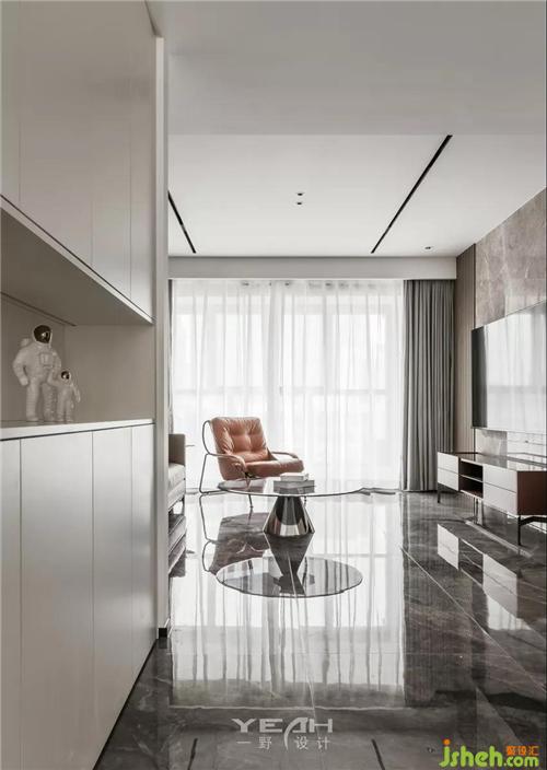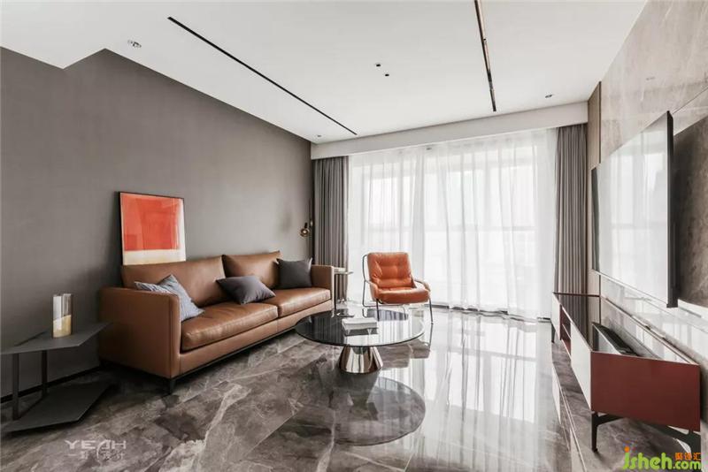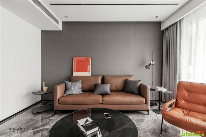 The elegant gray wall covering background of the living room, gray stone and wood veneer, use orange and red to embellish the space, and put the temperature into the gray-scale cool space, giving people a sense of sudden openness, without losing fashion, magnetic lamp The use of modern simplicity has been brought to the extreme.