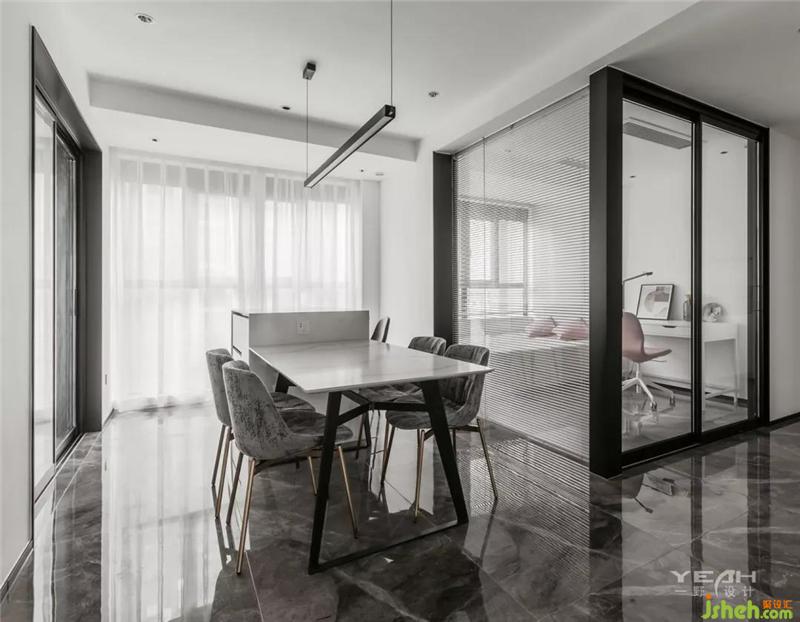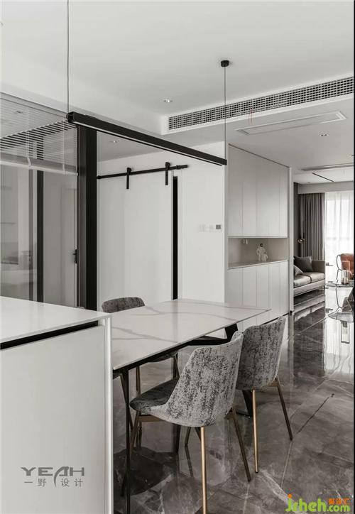 餐厅区域外扩,增加中岛,并同时打开和书房的原建筑墙体,大面积的玻璃窗、玻璃隔断和移门,室内设计师让自然光和空气自然流通,打破心理的局限,营造出一种通透的自在,这似乎也于无形中折射了设计价值的所在。