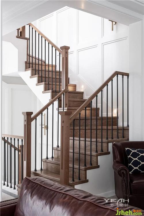 樱桃木色的楼梯用防滑地板铺设,室内设计师为家里的四位长辈带来贴心的使用感;色系搭配与客厅呼应,和谐自然。