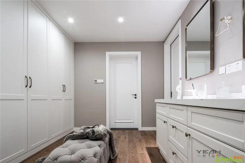 业主并不追求过大的衣帽间,将适当的储物空间让给双台盆,室内设计师让两个空间同时挣脱功能束缚,变得宽敞宜人。