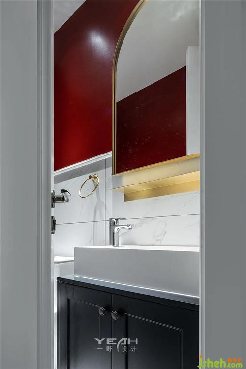红色的半墙和黄铜镜子极具设计感,室内设计师复古华丽,让空间眼前一亮。