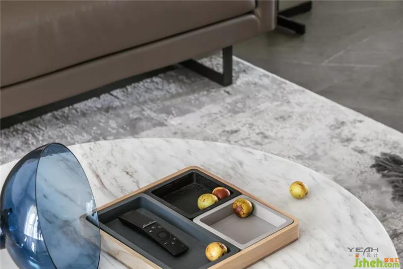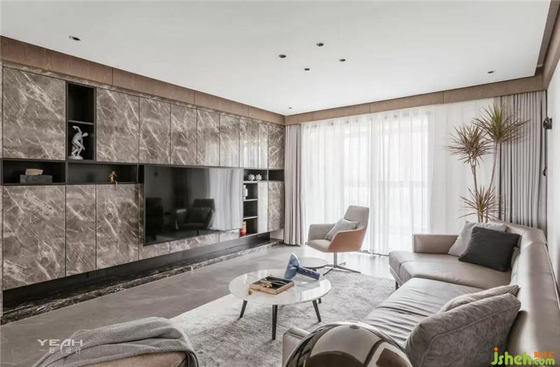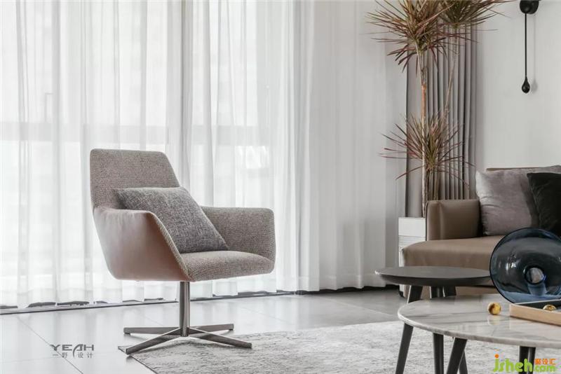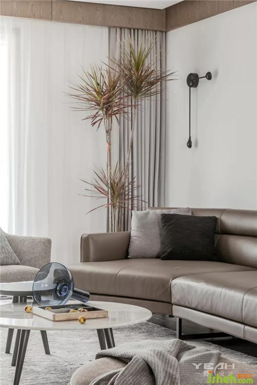 采用极简风格的家具搭配着深灰色质感的哑光瓷砖,无主灯的设计,构造了一种雅致的空间,同时与整体造型电视背景墙之间达到一种平衡。