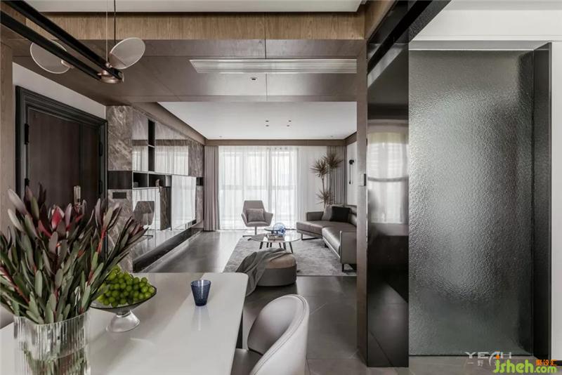 The dining room is connected to the activity space, with the intervention of black cabinets, translucent frosted glass, interspersed with soft lighting and finishes, and closely connected with the living room.
