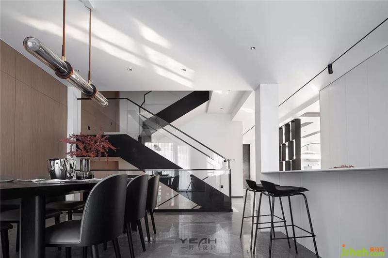 楼梯,透明玻璃与黑色金属结合,贯穿了简约,大方的设计风格。设计上做到了点线面的结合,苏州别墅装饰使楼梯成为空间交流的纽带。