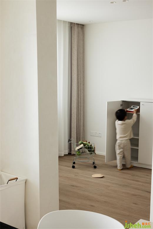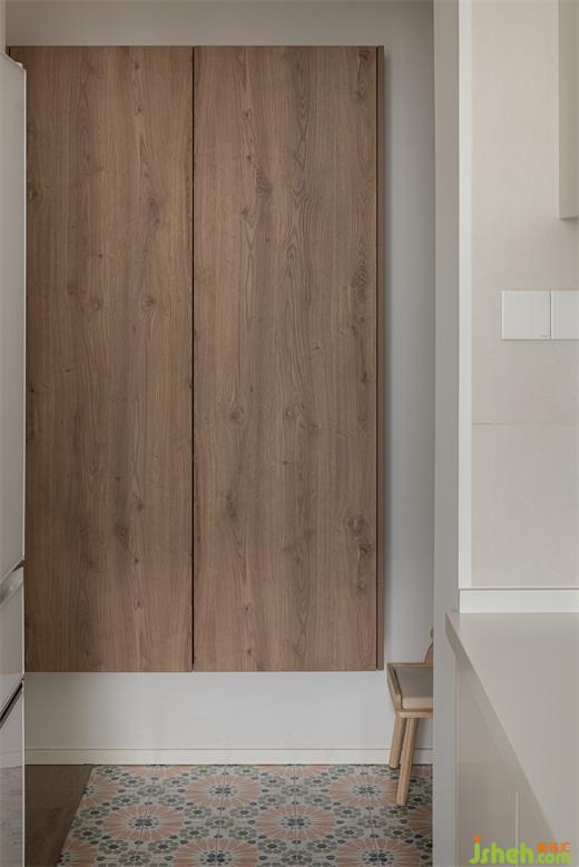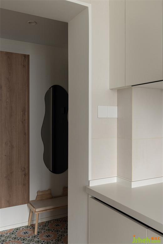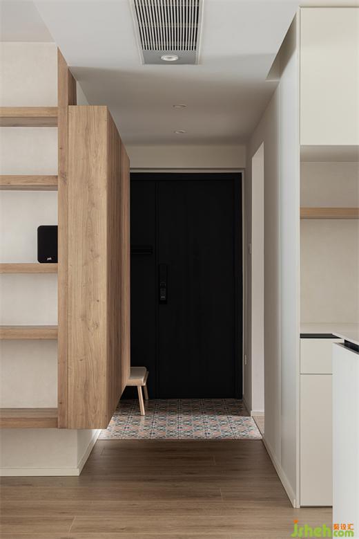 入户玄关以原木色为主,搭配花纹瓷砖,细腻精致,点缀空间色彩之余,也为生活增添了一丝趣味性。一把方凳小巧温润,潜藏着细致入微的贴心。湖左岸大平层装修设计悬挑式鞋柜增添空间立体感与时尚度的同时,也为日常清洁提供便利。