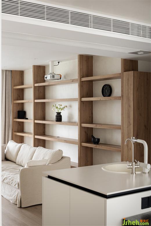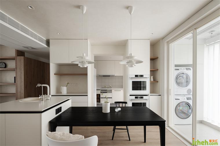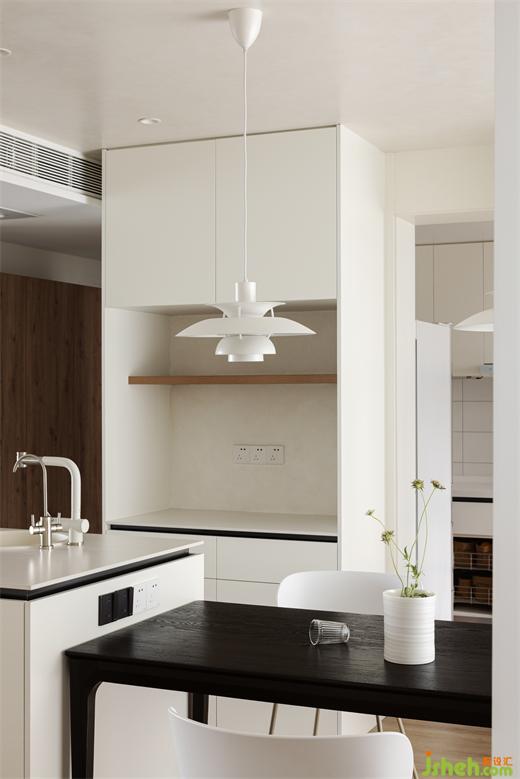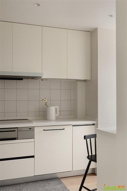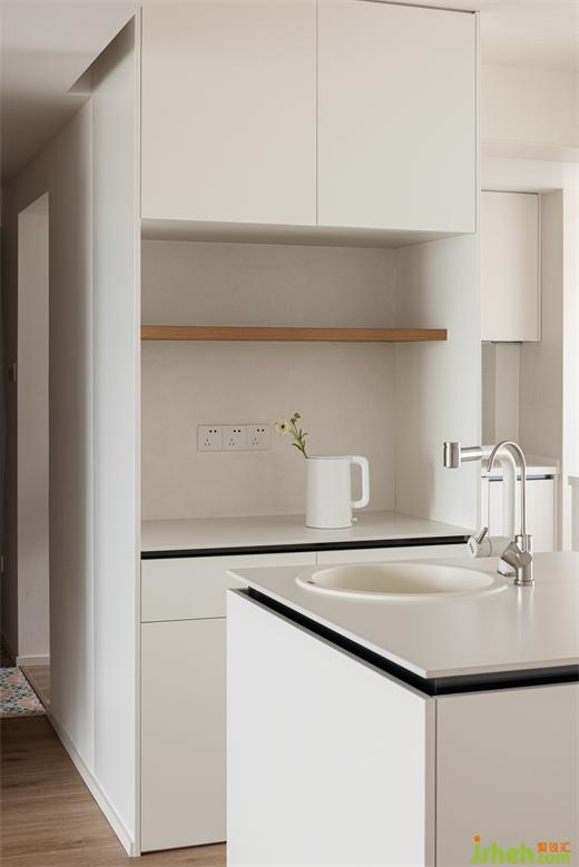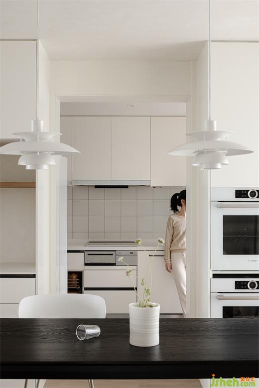 一体式设计,让客、餐厅与厨房之间似乎融为一体,却又泾渭分明。纯白无暇的厨房,湖左岸大平层装修设计打破刻板印象,为居住者打造出一个宁静、舒适的烹饪空间。白色橱柜与方格砖搭配,以一朵小花点缀其间,干净整洁,又自然成趣。