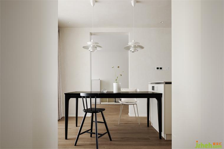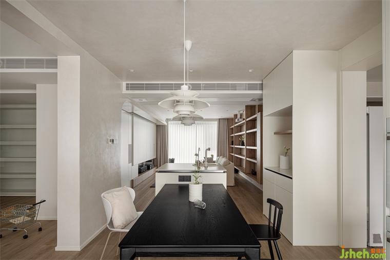 隔而不断,保留空间的开放性,打造多层次的视觉体验。玻璃移门最大程度保留自然光线进入空间,让阳光穿过窗户,洒满室内的每一个角落。黑色餐桌与岛台相连,经典配色续写时尚。餐桌的一抹绿意,湖左岸大平层装修设计让春意光顾此间,生活由此被赋予了自然生机。