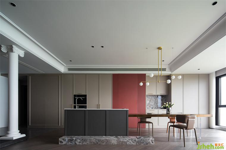 木质与大理石构筑的空间简约而有质感,金属和皮质穿插其中,苏州大平层设计渲染出精致高雅的用餐氛围。