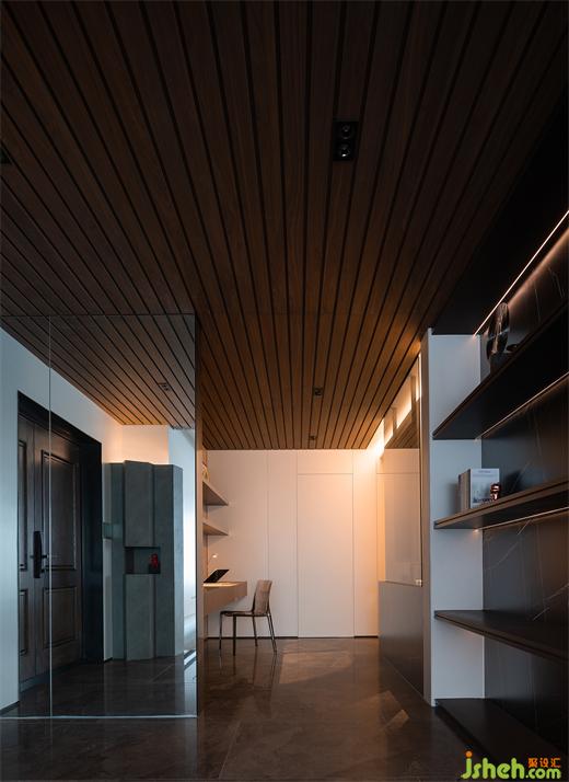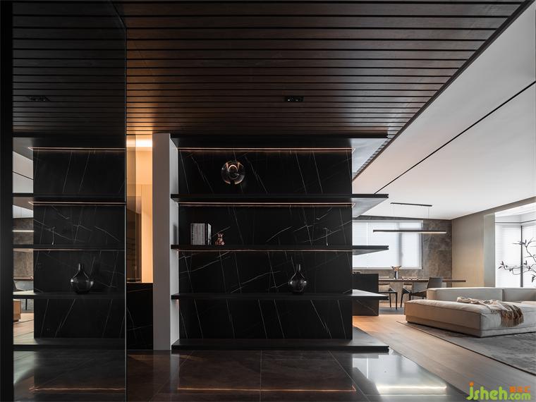 明与暗,黑与白,泾渭分明的对比带来视觉张力,在入户的刹那扑面而来,宣告屋主与众不同的品味,和对生活独特的理解。贵阳豪宅设计穿衣镜与墙面融合,映照室内,延展空间的宽度,让人在虚实之间享受无尽空间感带来的舒适体验。