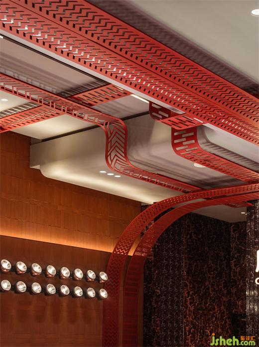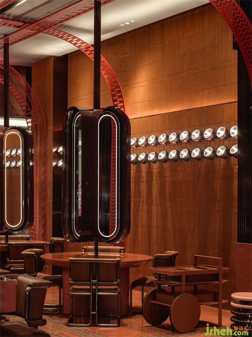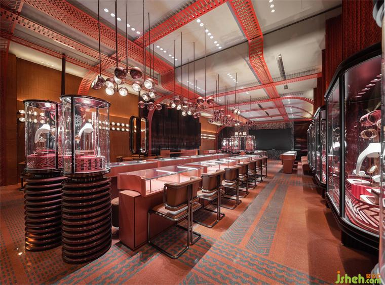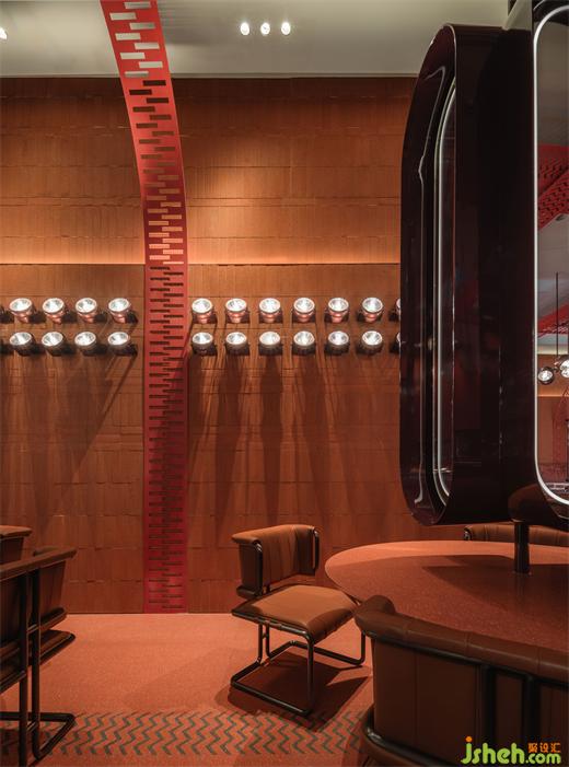 不同款式的轮胎在经过沙地、雪地、泥泞路段等,会留下不一样花纹的车轮印。珠宝店设计师通过艺术性思考,认为这些不同花纹可以演变成更被女性客户接受的图案和印花,于是他们设计并亲自绘制不同车轮印样式,以红色为底,花纹镂空,拉出长条的金属板装饰在天花上延伸,地板的图案与天花也形成呼应。抽象再设计的图案缓和了汽车元素本身的硬朗,为空间增添与珠宝店本身气质相符的光影与魅力。