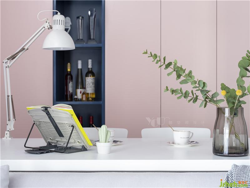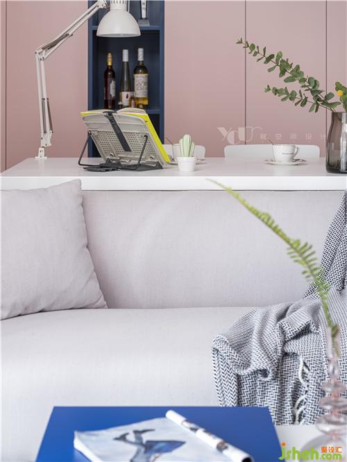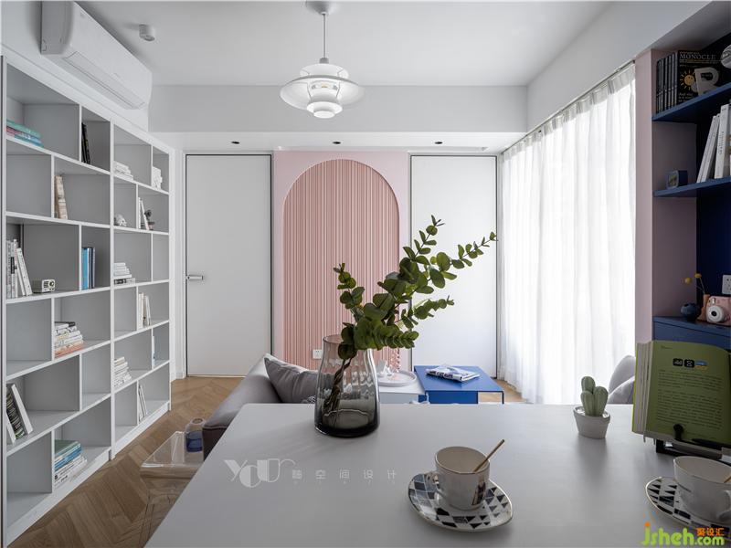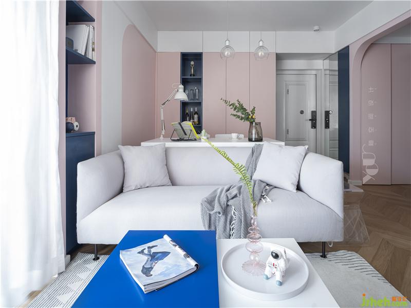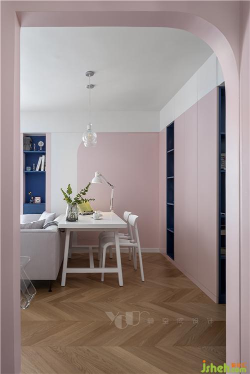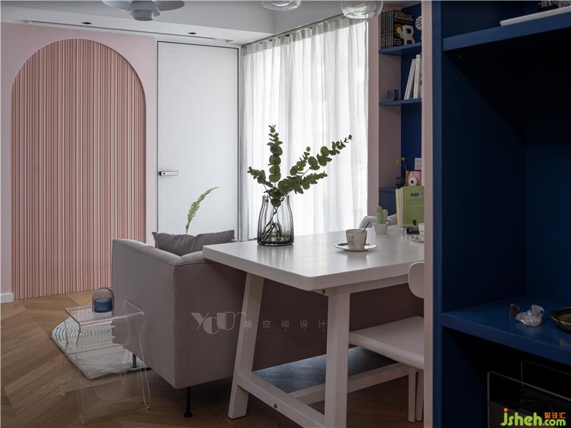 刷上白色,我们将只有15平的空间摊成画布来作画:涂上湛蓝的海水和粉红的云彩,木色为舟,在夏日的清新梦幻中恣意漂流,画布有限,意境是无尽的。保留原顶,只是在墙上走了一圈薄边,让天花和墙面有一个层次上区分;房门用的极简门,弱化了门在空间的存在感,更像是墙面上的一幅几何画。作为视觉焦点,拱券门的背景和半弧形的门洞设计,深圳室内设计师使软性的粉色有了筋骨,令空间达到了软硬平衡,十分出彩,让原本略显平平的基调变得耐人寻味起来。