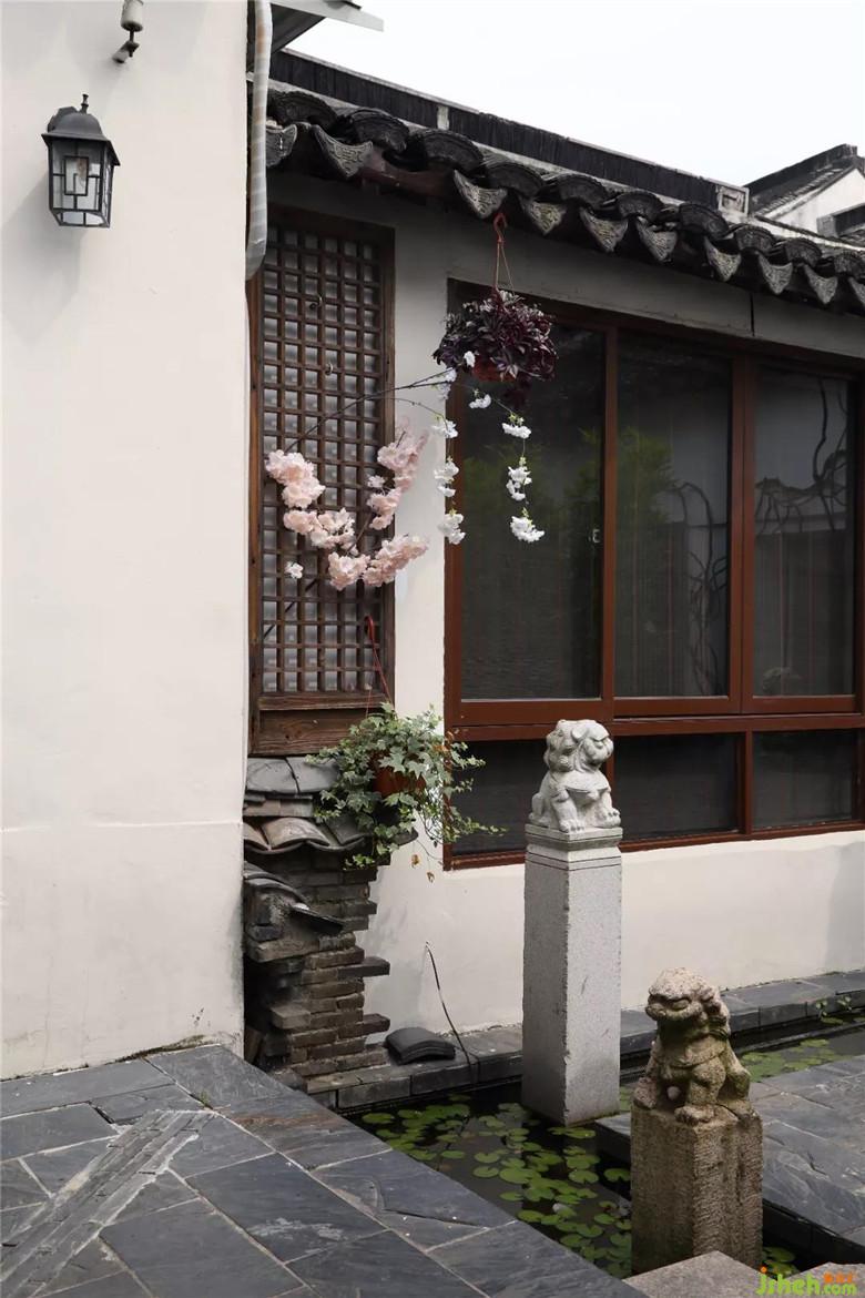 在庭院中,可以看到以蓝色桌椅、遮阳伞为点缀,为进入此门的人带来一种假期中的休闲。且设计师别出心裁地使用水与浮叶作为分隔工具,以石阶作为连通两者之间的工具,在石阶两旁各摆一只小石狮。当有来客穿行之间,可再为其洗濯身上所携烦恼。