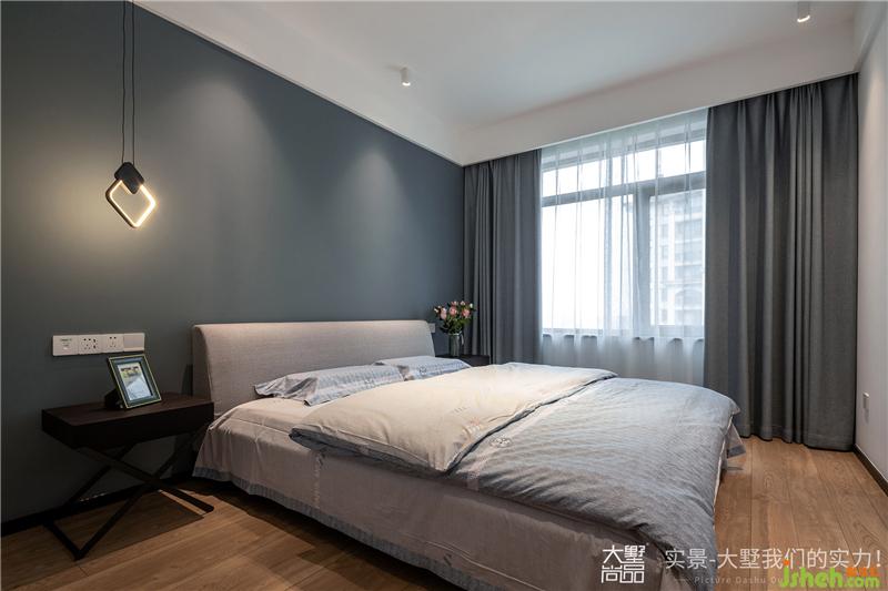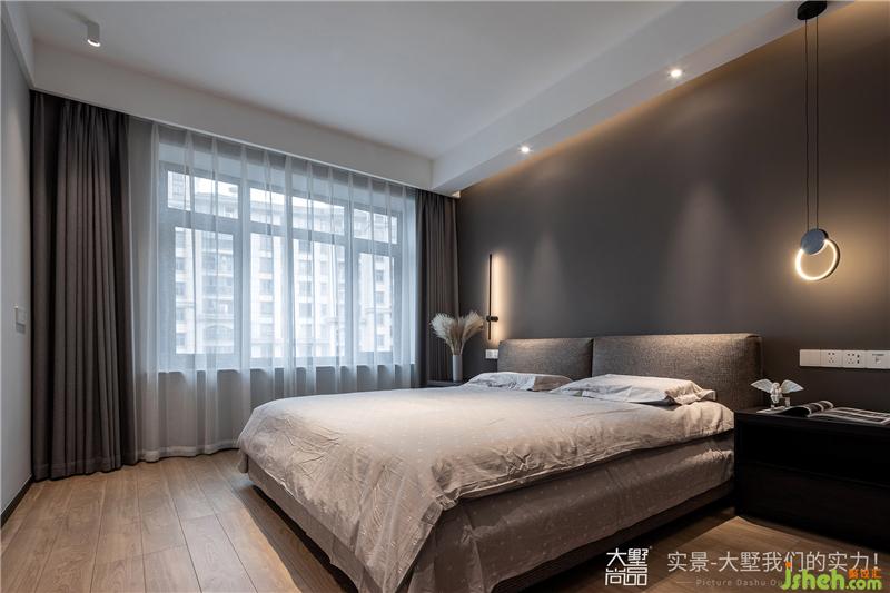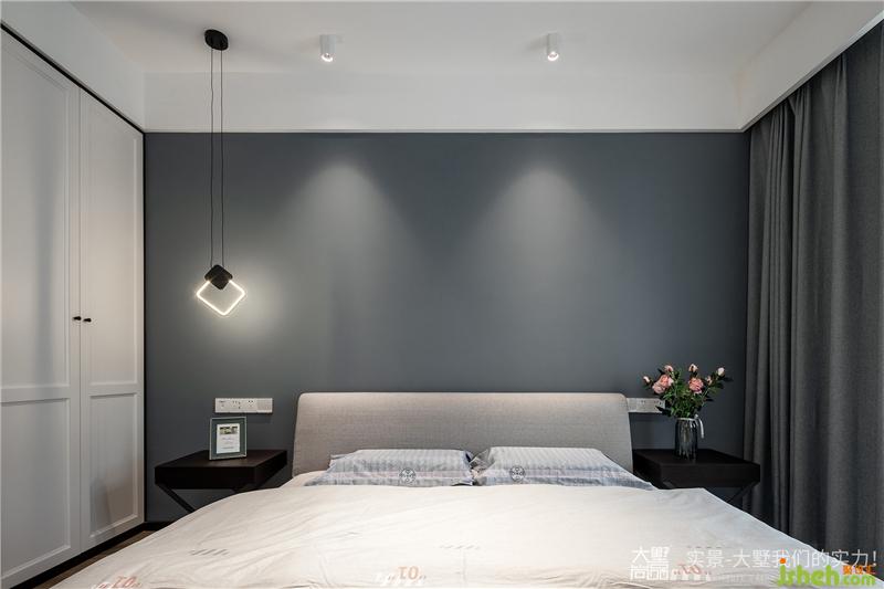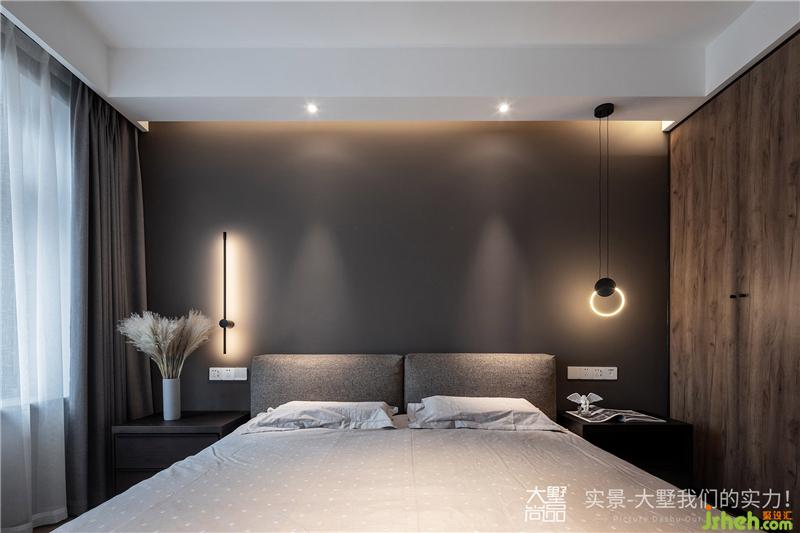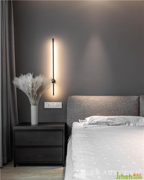 卧室以灰色墙面穿插黑色线条灯饰