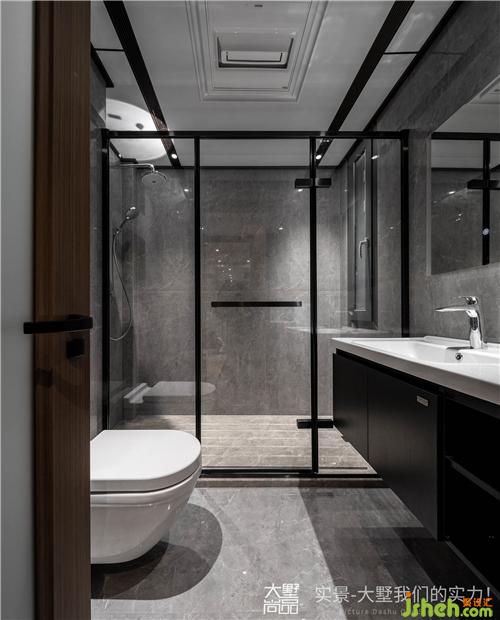 淋浴区以玻璃作为隔断,黑色线条勾勒