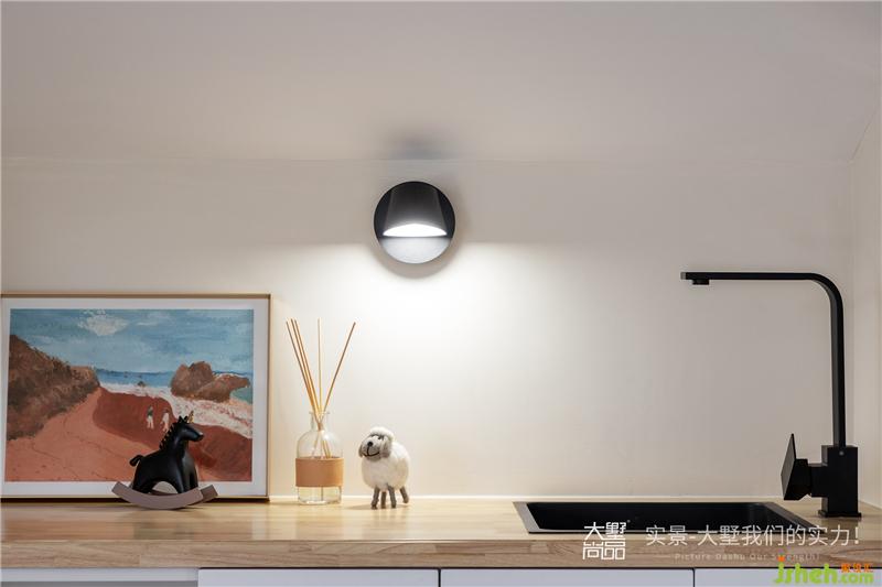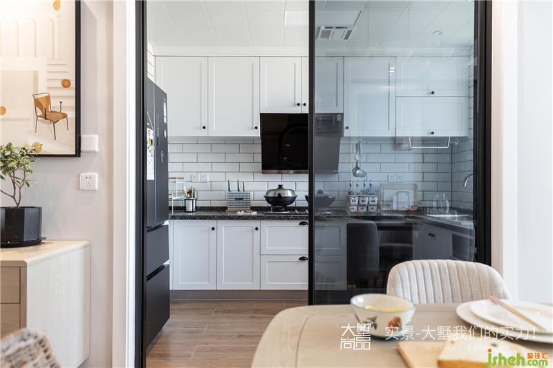 墙面铺陈小长砖,黑色亚光面美缝衬托砖面更加的亮泽,橱柜选用白色门板,让靠北面的厨房显得更加明亮,黑色的操作台更方便清洁。