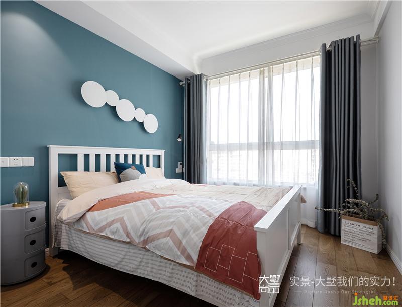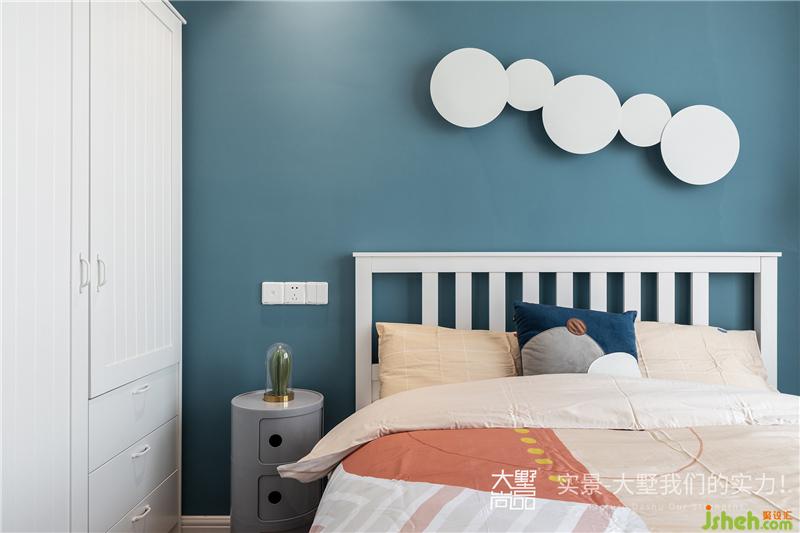 蓝色背景墙在大面积白色中已然占据最醒目的焦点位置,圆形装饰品让空间看起来更加具有活泼特点常州室内设计师。