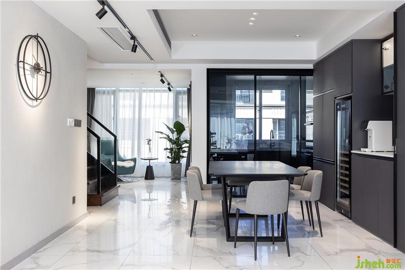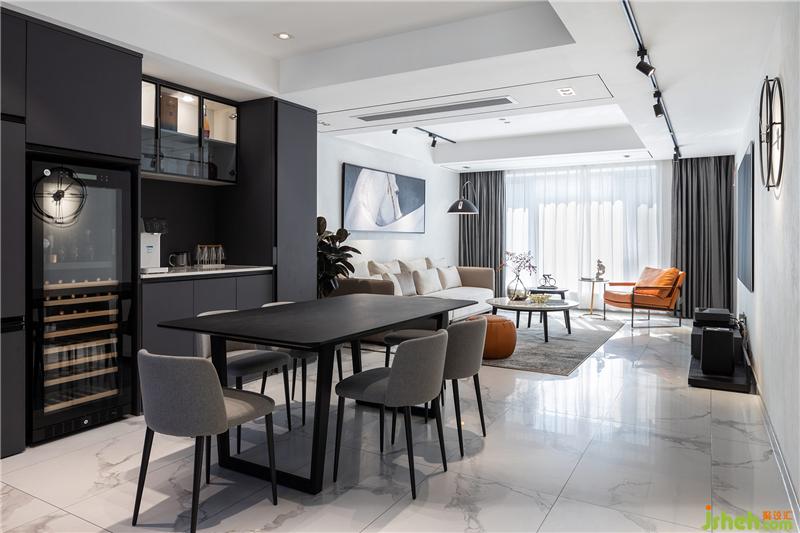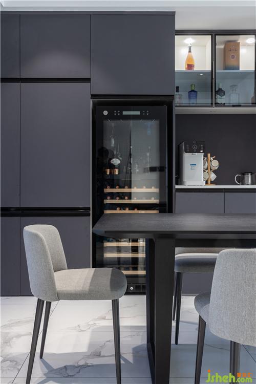 餐厅区域,设计师选择了黑色作为这个空间的主色调,用实际效果化解了主人对于这一大胆用色的疑虑。一组顶天立地的餐边柜将西厨、用餐、收纳功能完美统一,并将冰箱嵌入其中,释放了厨房空间。内嵌的红酒存储柜,成为空间的审美亮点。