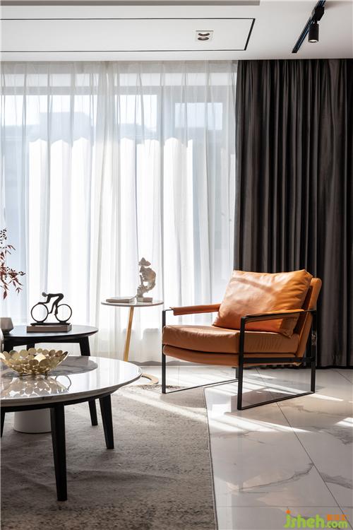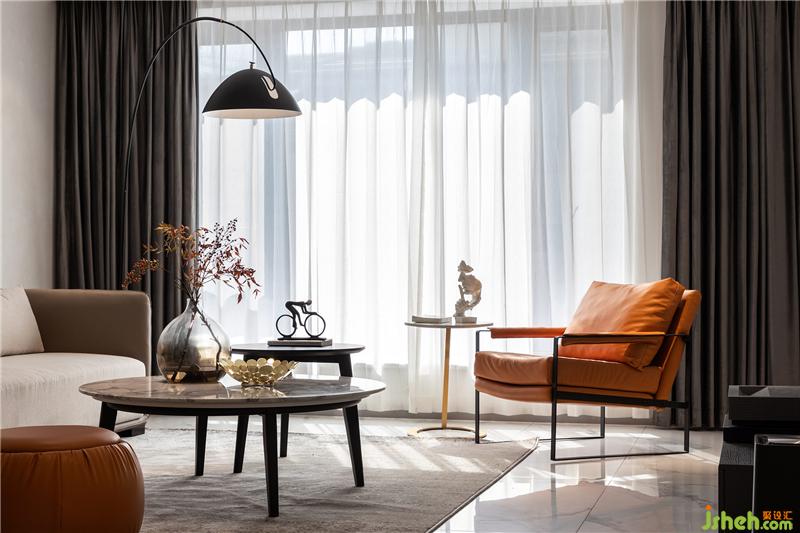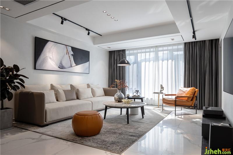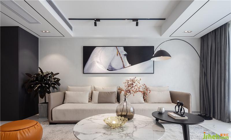 弧线型钓鱼灯和橙色单人沙发,打破了空间的刻板,增加了更多灵动的气息。一幅以马为主题的艺术画,成为空间的亮点。两组轨道灯,显露出一丝工业风气息和家居生活的随意感。