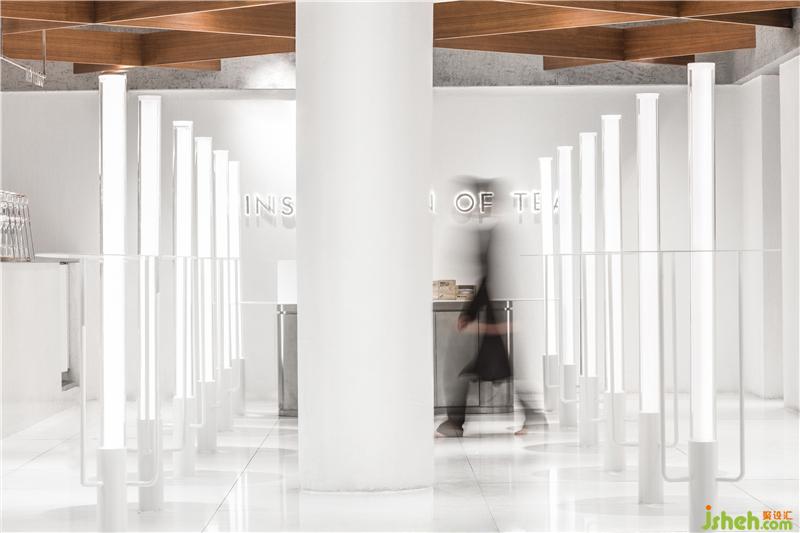 MOC DESIGN一反克拉码头街区昏暗、为了营造神秘感而以封闭式形态呈现的思维,以开放的形式、一览无余的布局及明亮的纯白色调出现在街区中。受到福康宁山上的灯塔所启发,MOC DESIGN在有限的空间中以阵列的形式设置了20个灯柱,其中一些结合高桌进行设计以满足功能性需求。店铺装修