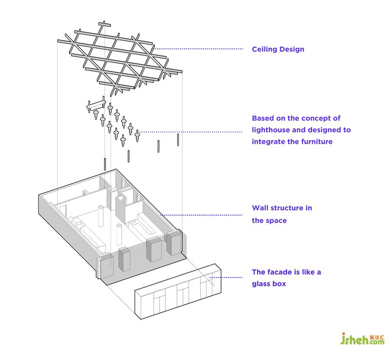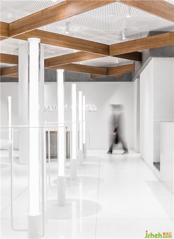 灯柱随着时间缓慢的变暗又逐渐亮起,以此重现灯塔的闪烁周期。人们可以透过入口前厅的玻璃盒子,看到店内的灯柱缓慢的明暗交替,结合自然光线的变化,空间由早至晚呈现着不同的迷人表情。店铺装修