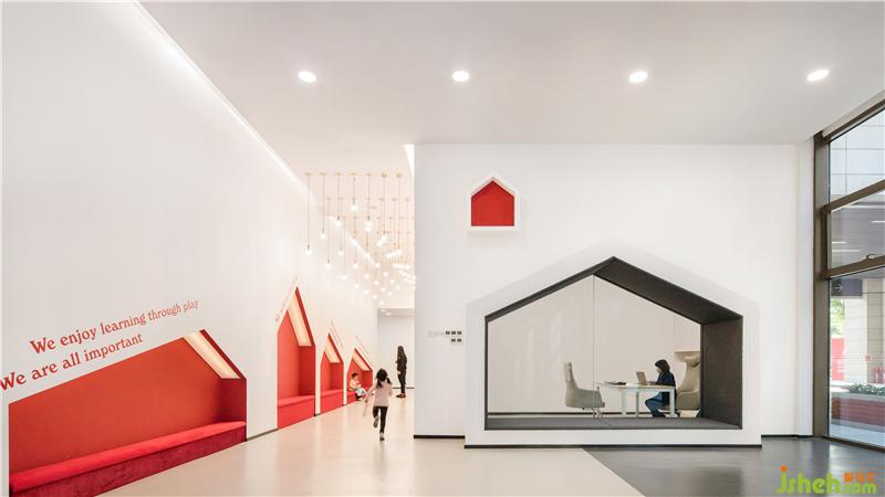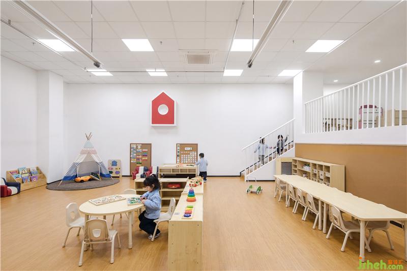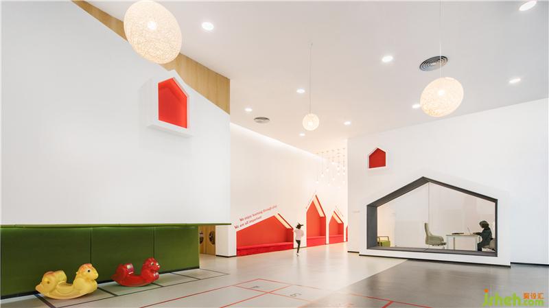 玻璃幕墙一侧被规划为公共活动区,日间的阳光充满该区域,公共活动区内定制了结合滑梯,攀爬,摇荡等功能的活动器械,有效的让孩子在游戏中认识到空间,平衡,速度和节奏,同时也是对户外活动场地面积的补充。装修公司