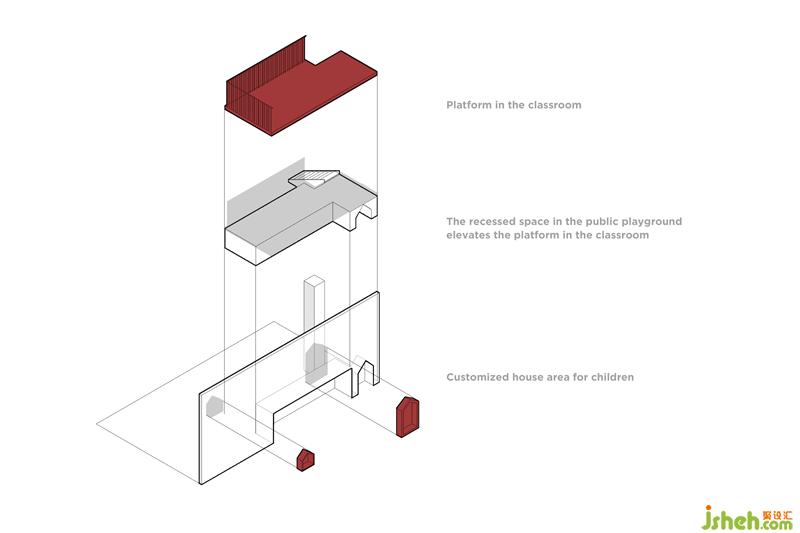 这样的错层也在教室中形成抬高的平台,丰富了教室的空间层次的同时也增加了孩子运动量。教室内还设置了独立的小房子,并将楼梯下方设计为可供儿童钻爬的小空间,这些空间在实际使用中深受喜爱,成了孩子们私下交换秘密和角色扮演的地方。