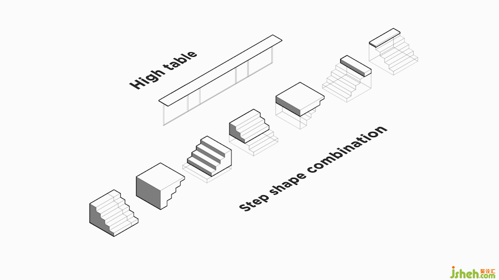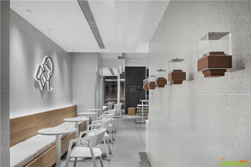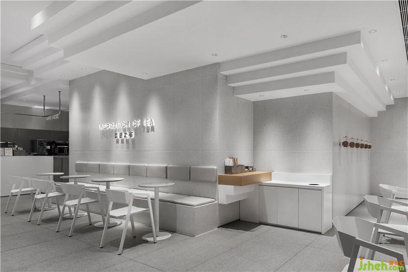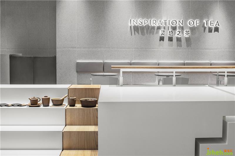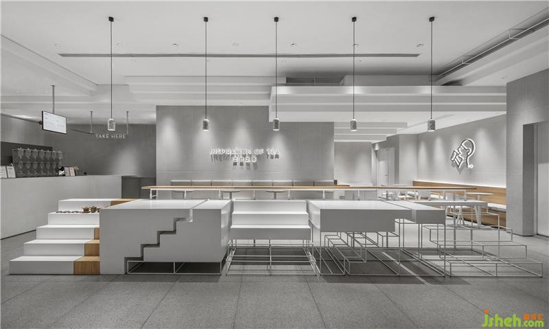 设计师将空间的功能区域如自助台等隐藏于纵横台阶之间,并为品牌方特别设计定制了一款茶具用于向顾客展示其采自不同产地的茶叶。奶茶店设计