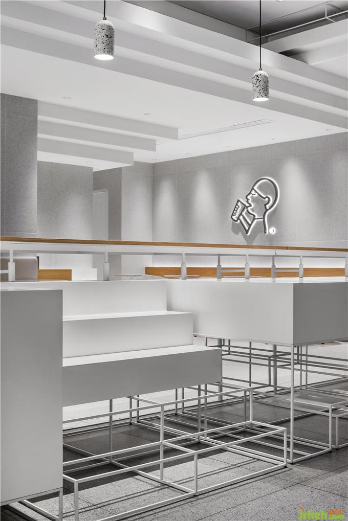 中岛区域的高桌组合装置做为空间的主角,摆列形式仿佛在尽然有序地诉说。实体和线框的台阶造型构成虚实结合的姿态,游走在天花纵横交错的台阶与整体空间体块之间,在空间整体纯白色调的渲染下,成为空间中的视觉焦点。台阶造型的分布,既可陈列品牌周边文化产品,也满足动线的划分,同时达到小憩饮茶的功能需求,人群的交流由此密切展开。奶茶店设计