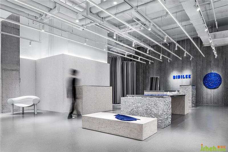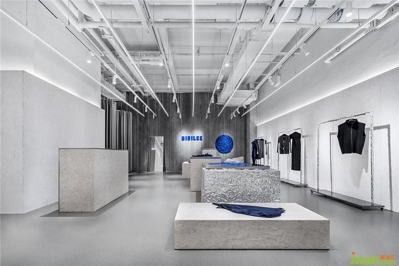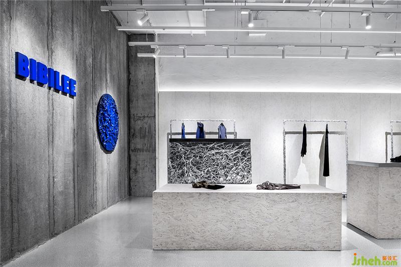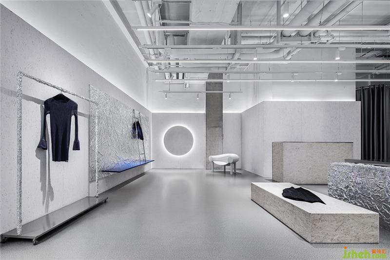 Based on the specific site and the construction period, designers abandoned the conventional excessive display and design in the fashion commercial space, and retained the original texture of the concrete columns and some concrete walls, only with the ceiling painted white. The white oriented strand boards (OSBs) are used to enclose the bottom wall, and set up the central display with stainless steel. The linear light strips establish the order within the space – no redundant surface decoration reflects a kind of restrained experimental aesthetic.