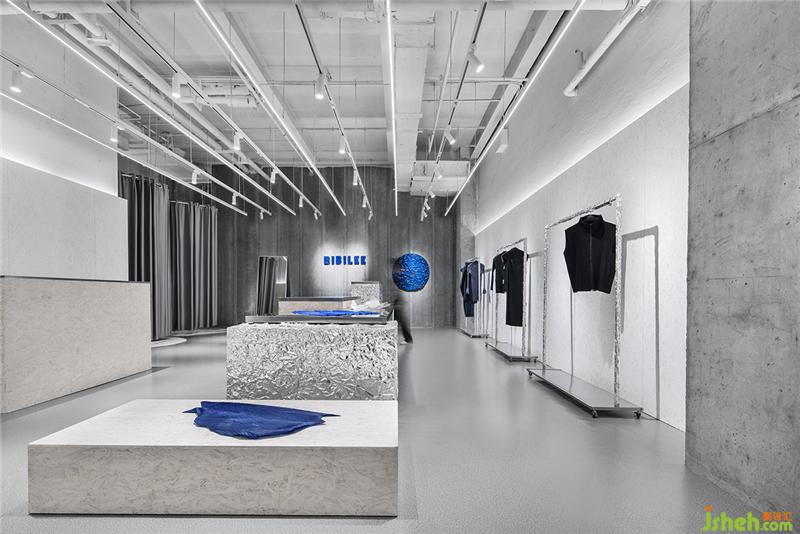 结合场地条件与工期要求,设计师抛弃传统服装商业空间对展陈设计的过度追求,保留了混凝土柱和部分混凝土墙壁原有的材质肌理,天花仅仅做了喷白处理。刷白的定向刨花板将空间的底部墙面围合,并结合冷冽的不锈钢搭建出了空间中部的展台,天花线性的灯带则强调了一种秩序感——空间中没有冗余的外在装饰,显示出一种克制的实验美感。