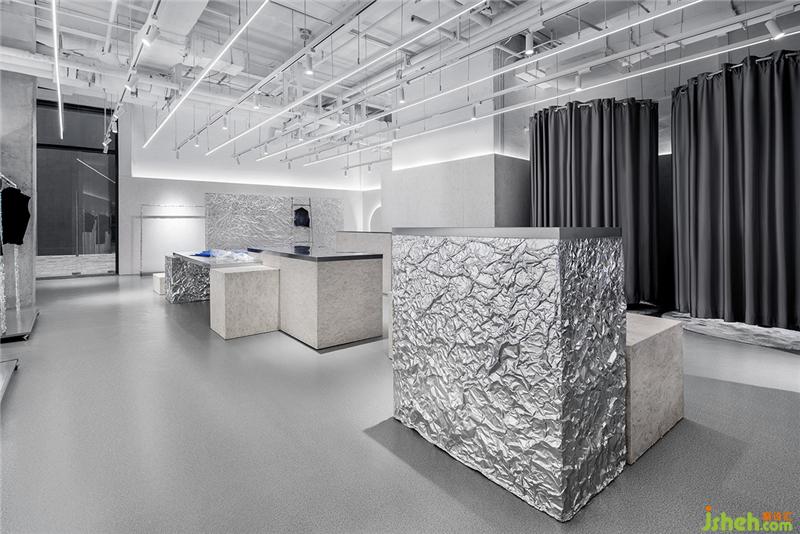 空间中没有固定的陈列架,取而代之的是showroom里最常见的金属陈列架,架子上包裹的锡纸低调的传达出品牌的核心工艺。